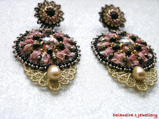Cercei realizati cu broderie panglica satin,margele Miyuki Delica si toho,rondele cristal,cabochon onix 10 mm,perla cultura auriu prafuit ,lantisor rhinestone 2 mm ,cabochon sticla ,accesoriu oval,filigranat si aurit,elemente dantela brodata cu matase laminata aurie.Marginile elementului central sunt decorate in culori acrilice bordeaux,negru,auriu si cusute cu margelute toho si delica. Platformele cu surub sunt din argint 925. Dimensiune 9x4 cm