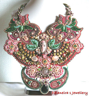 Colier realizat cu broderie matase, bumbac,matase laminata, margele Miyuki Rocaille si Delica, toho, margele si pietre cabochon de piatra lunii in tonuri diverse, marchiza de rhodochrosyte 40 mm,accesorii filigranate aurite, satin,margele Cehia,onix fatetat, lacrima cristal negru,cristale si perle swarovski.Partea superioara a colierului este detasabila si are accesorii de prindere in ambele parti ; lungime 31 cm. Boderia are aprox 23 cm lungime si 21 cm latime .Culori folosite: bordeaux, rosu burgund,somone,roz prafuit,auriu,bronz,cupru, negru,verde .Timp de executie aprox 80 ore.